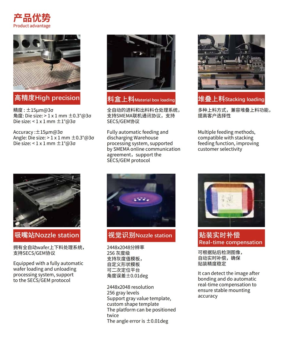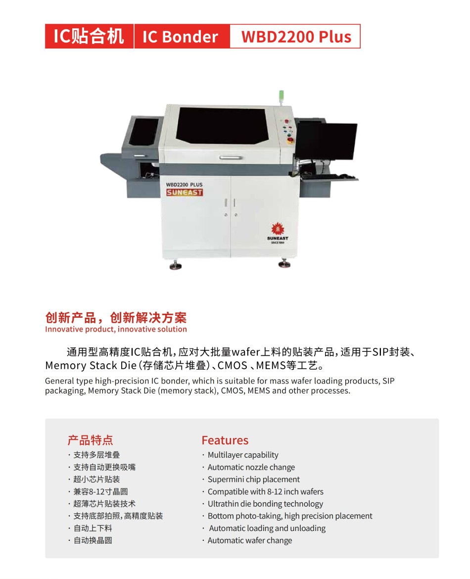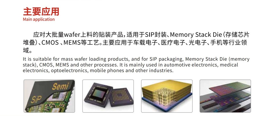 通用型高精度芯片貼合機,應(yīng)對大批量wafer上料的貼裝產(chǎn)品,適用于SIP封裝、Memory Stack Die(存儲芯片堆疊)、CMOS 、MEMS等工藝。